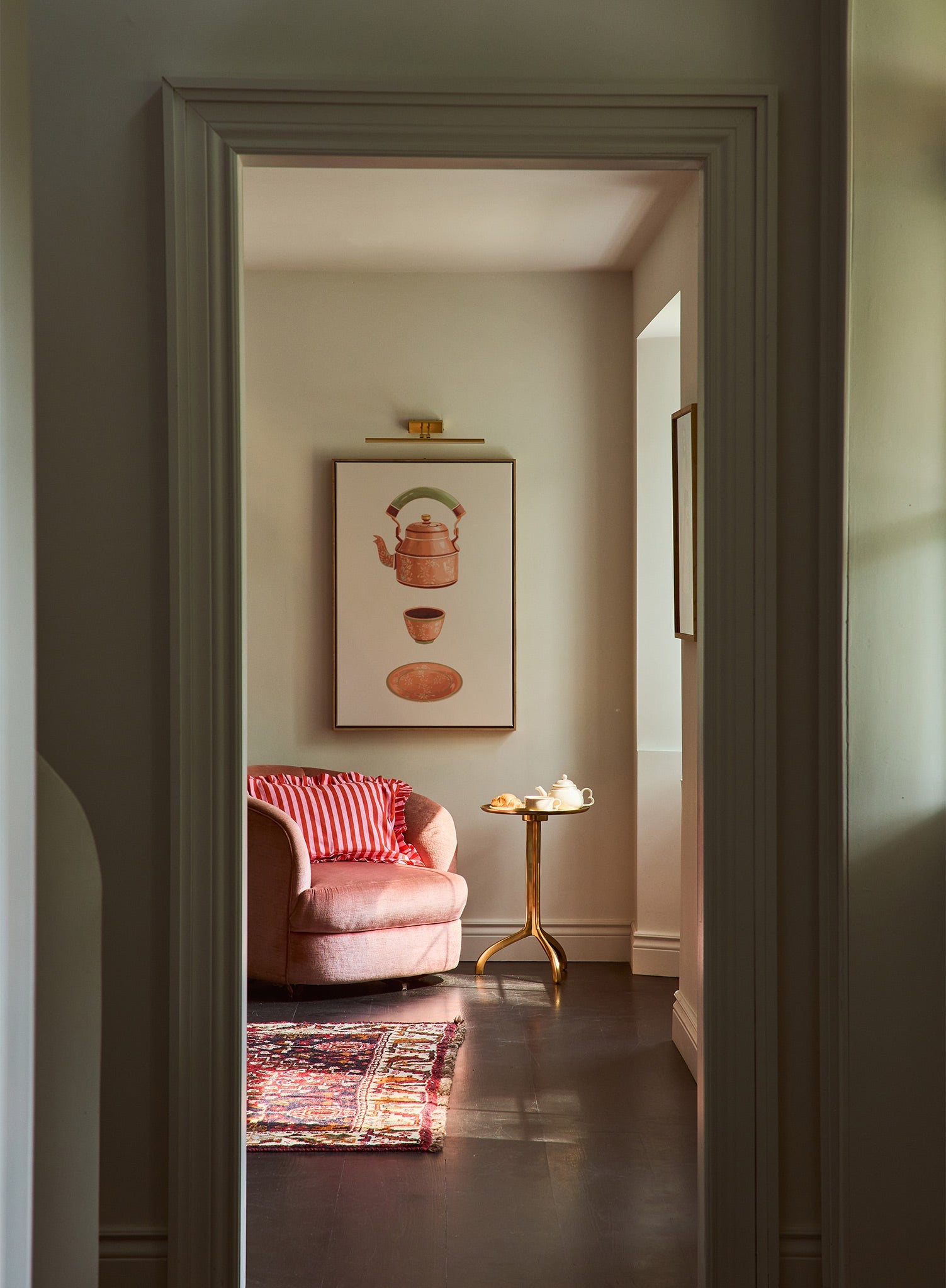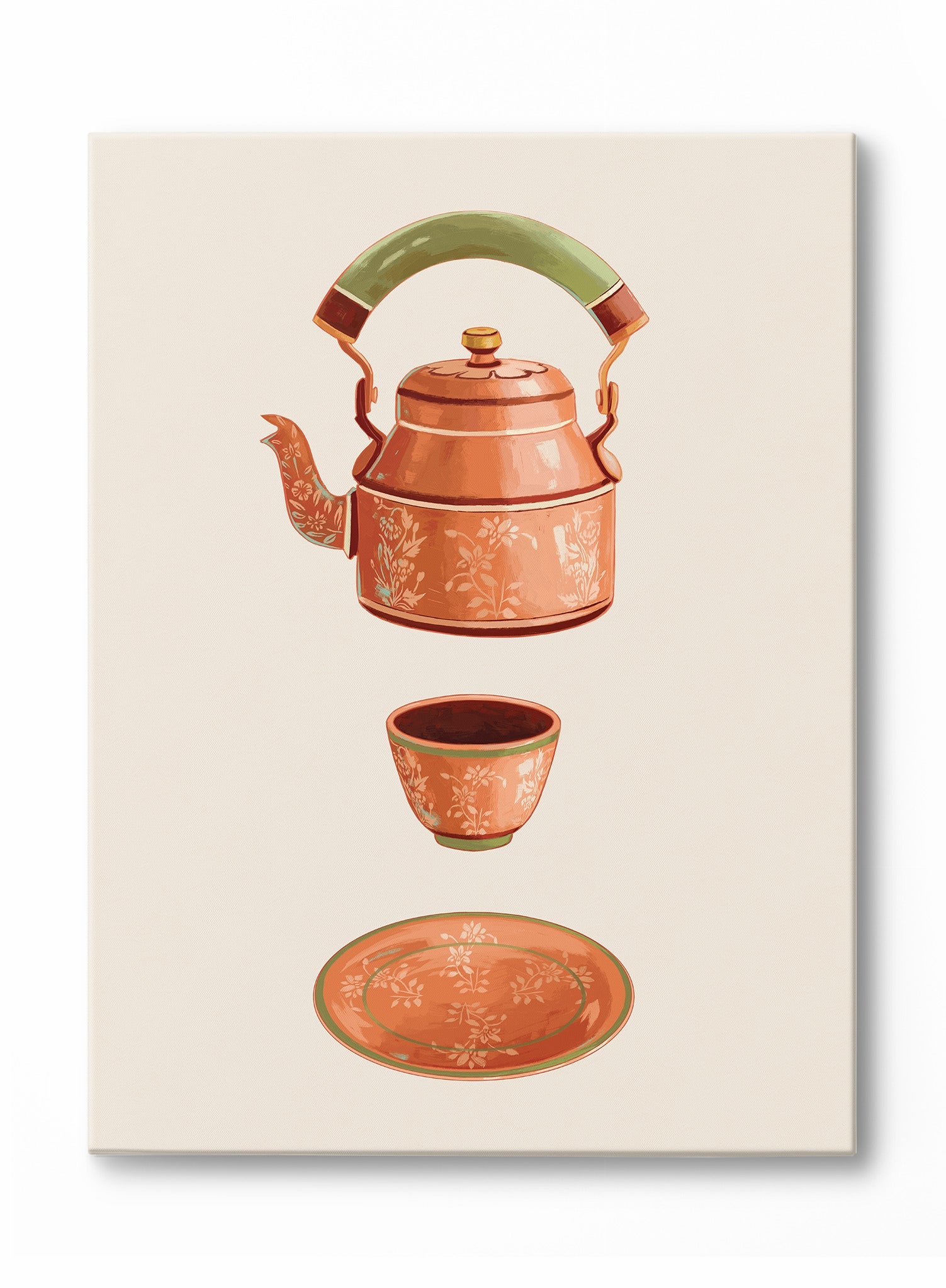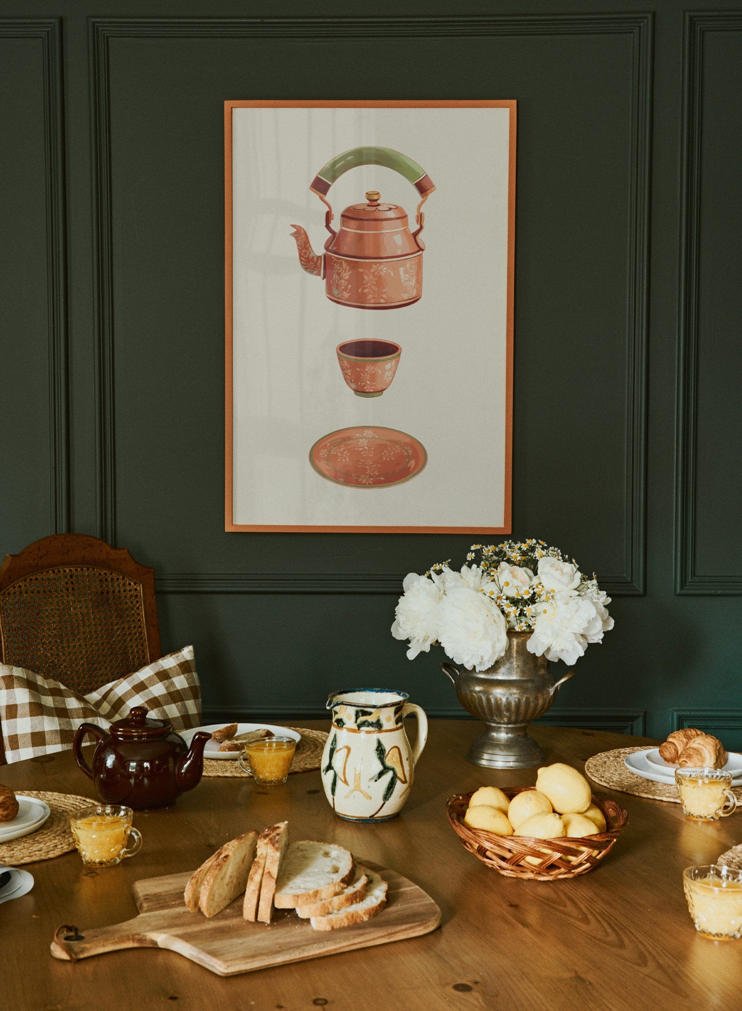 This print presents a charming scene featuring a vintage-inspired teapot, cup, and saucer, each adorned with delicate floral patterns. The teapot, with its warm terracotta hue and contrasting sage green handle, appears to float above the matching cup and saucer, creating a sense of playful suspension. The background is a soft, neutral tone, allowing the intricate details and colors of the objects to stand out vividly.