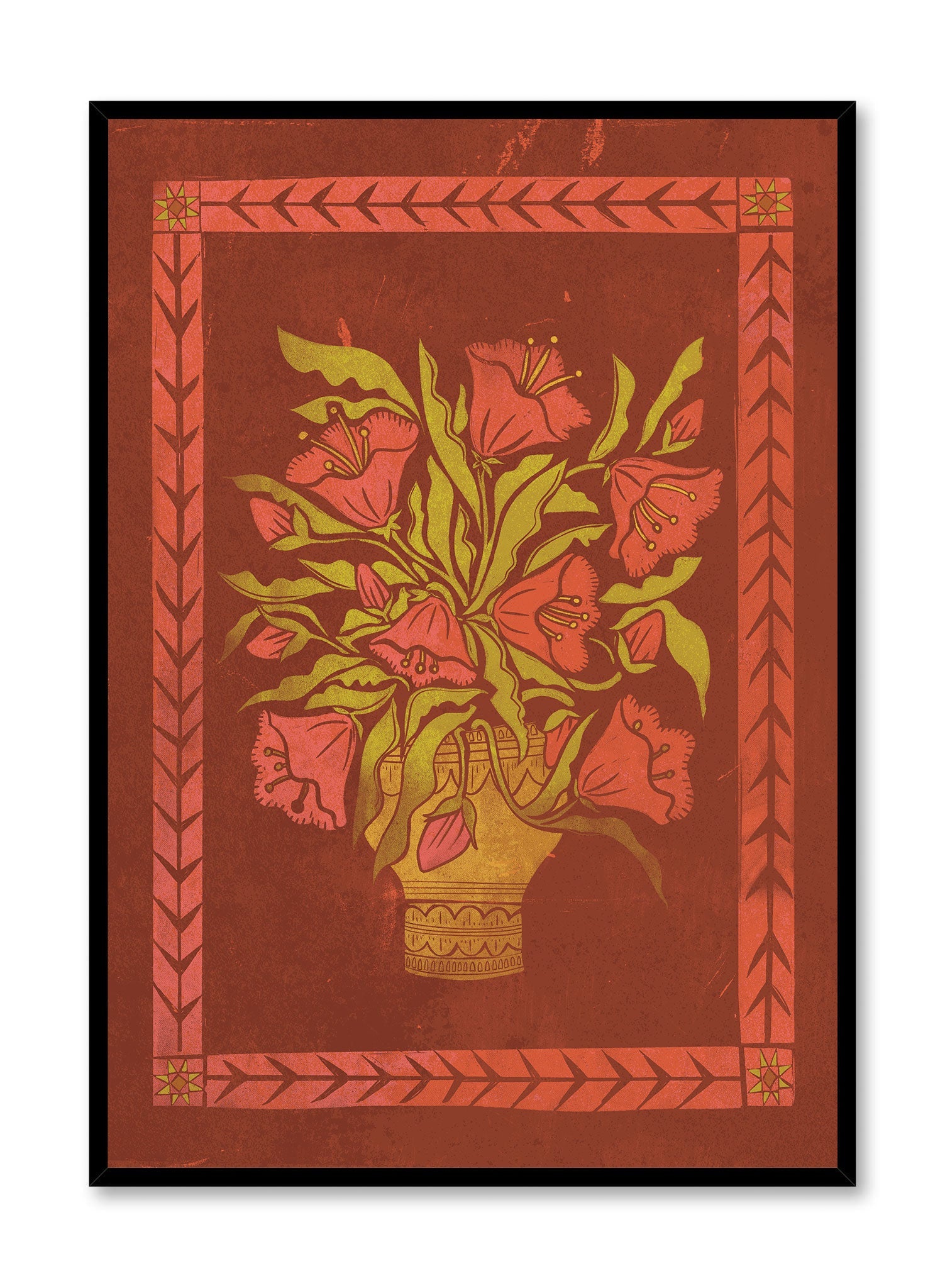 This print features a bouquet of stylized flowers in a decorative vase, set against a rich terracotta background. The flowers, with their bold red petals and intricate detailing, are framed by a geometric border that adds a touch of symmetry and structure to the composition. The overall aesthetic is reminiscent of traditional folk art, with a focus on simplicity and vibrant color.