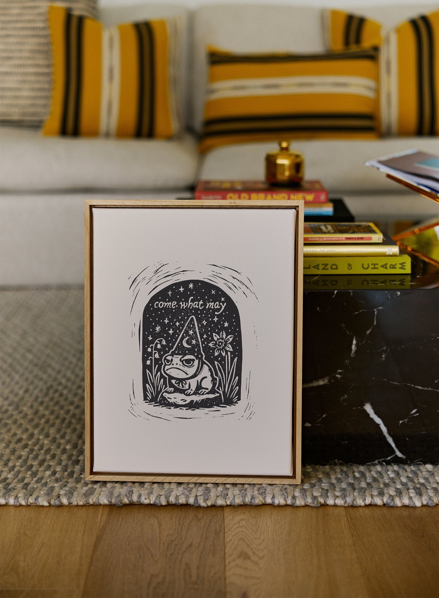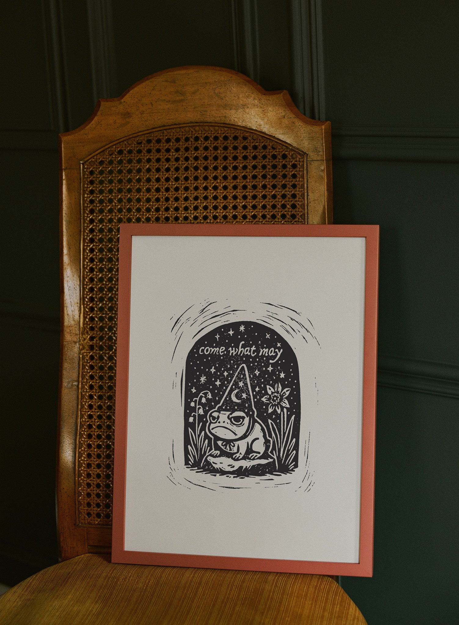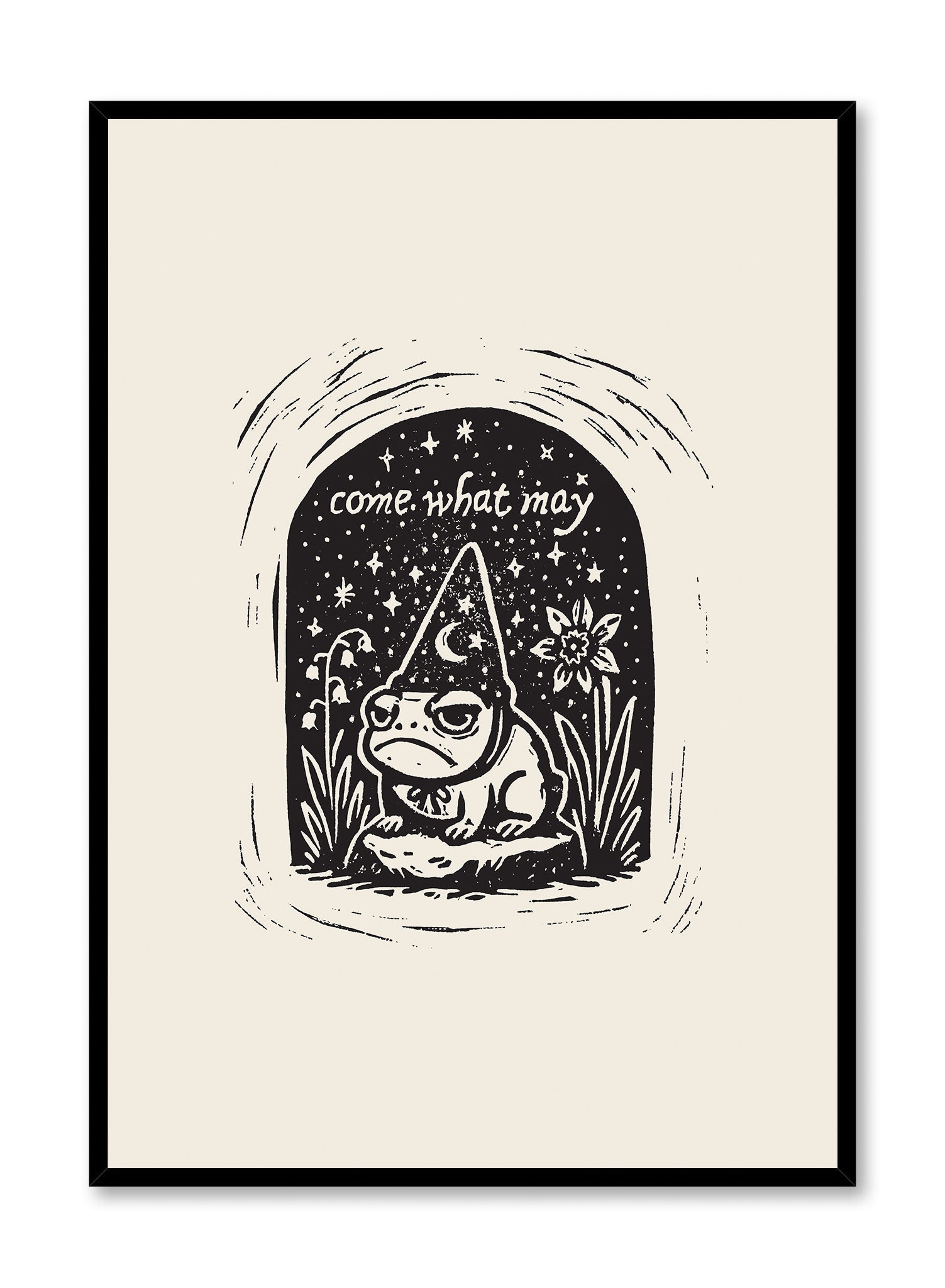This print features a charming illustration of a contemplative frog donning a pointed hat, nestled within a whimsical archway. The phrase 'come what may' hovers above, surrounded by twinkling stars and a delicate flower, creating a scene that feels both magical and introspective. The monochrome palette enhances the simplicity and focus of the design, drawing attention to the intricate line work and playful details.