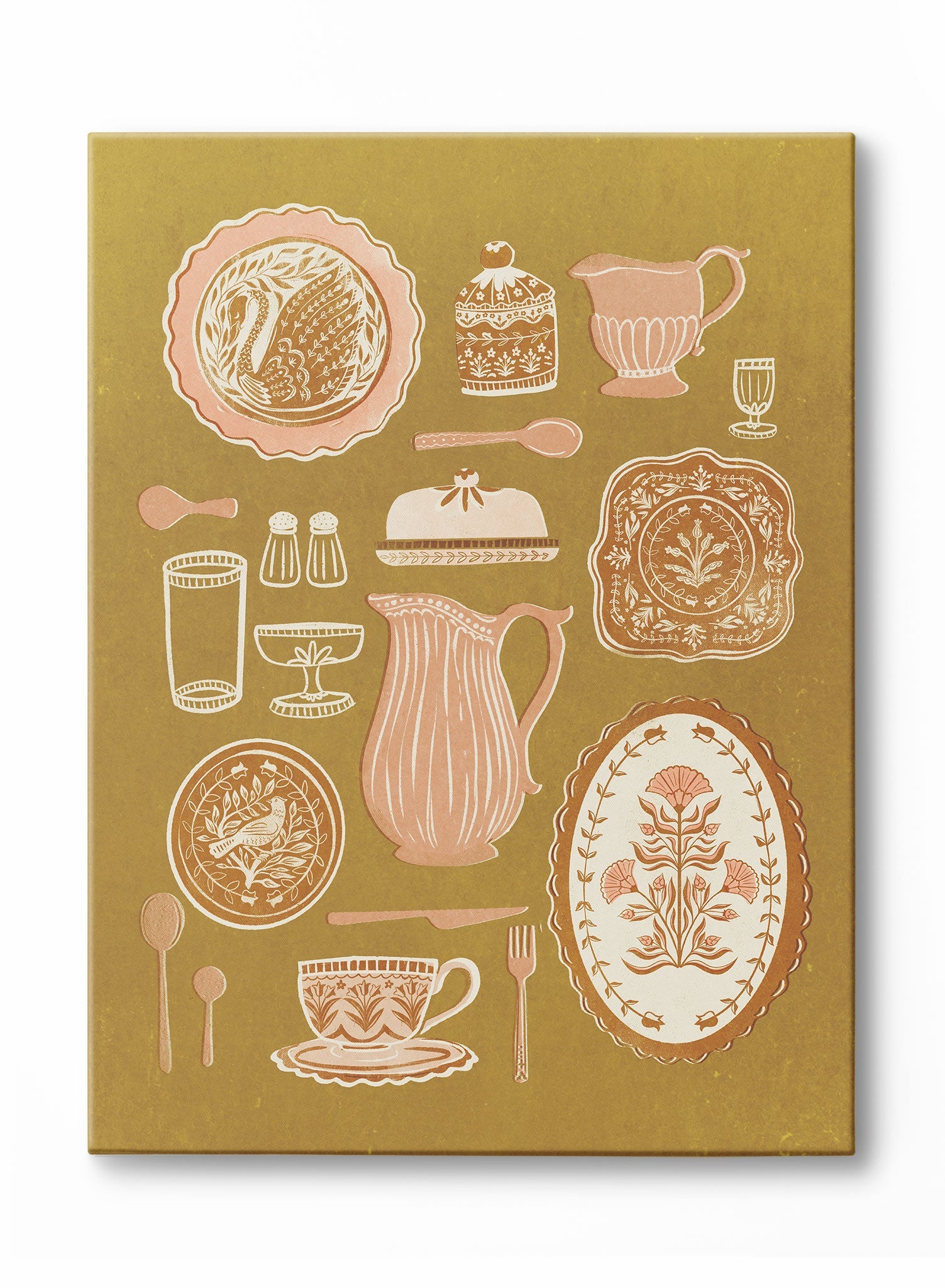 This print presents a charming array of vintage-inspired tableware, meticulously arranged against a warm, golden backdrop. Each piece, from the intricately patterned plates to the elegantly shaped pitchers, is rendered in soft, earthy tones of terracotta and blush. The delicate detailing on the ceramics, including floral motifs and subtle textures, evokes a sense of nostalgia and craftsmanship.