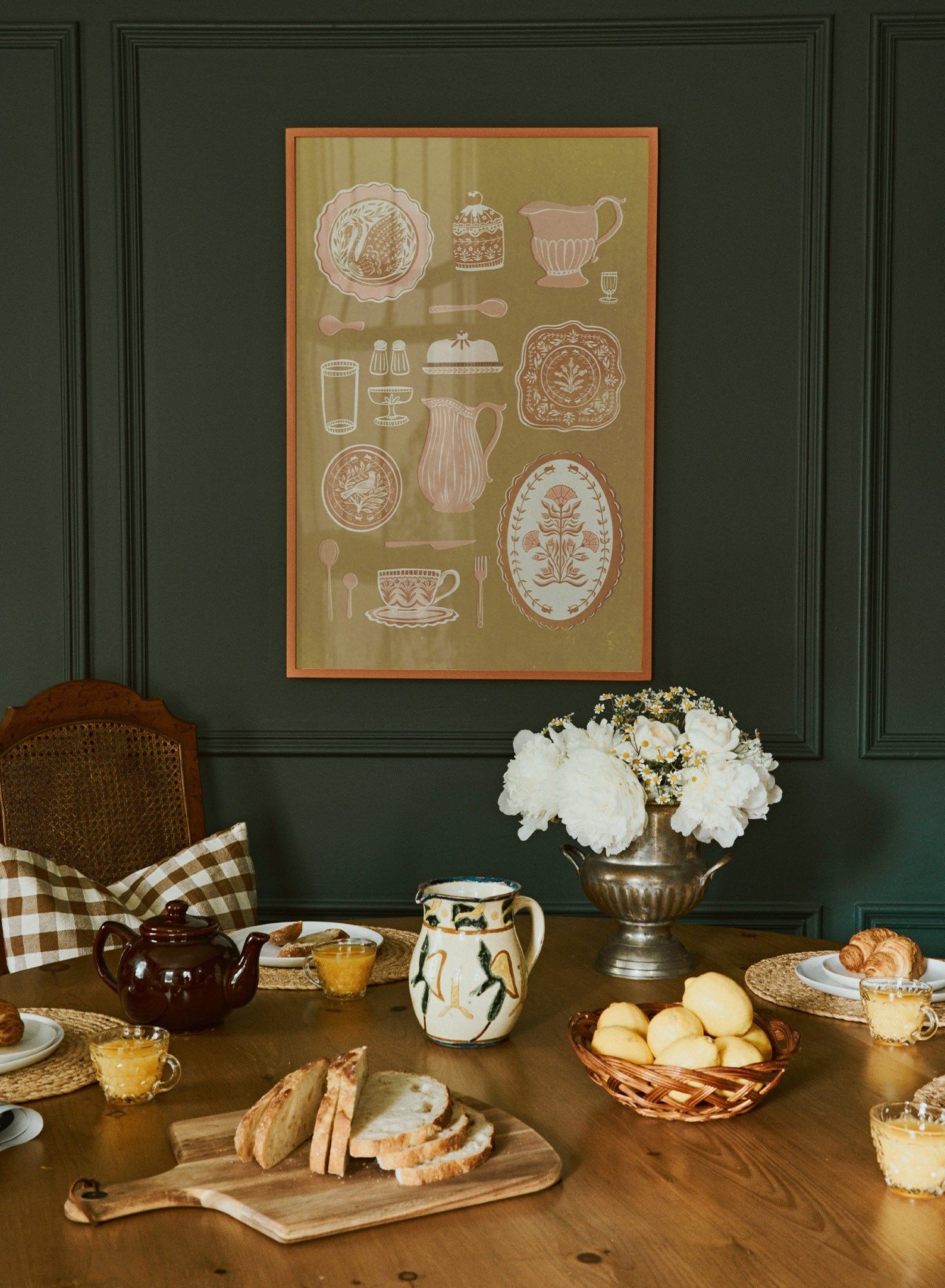 The harmonious blend of muted colors and intricate designs creates a visually soothing effect, inviting a closer look at the artistry involved. The gentle contrast between the warm background and the soft hues of the tableware enhances the print's inviting aesthetic, making it a versatile addition to various decor styles.