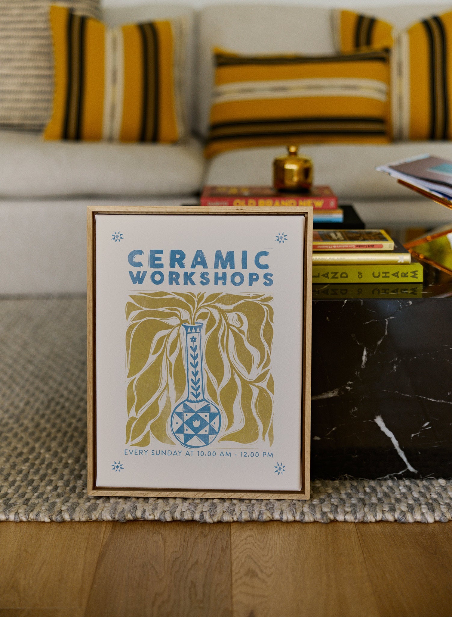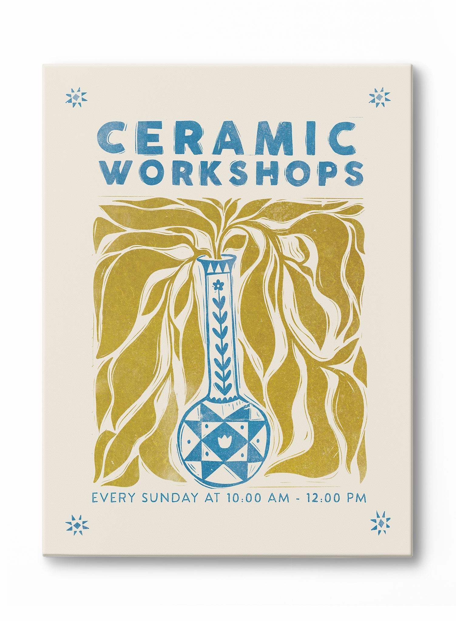 This print features a striking blue and white ceramic vase, adorned with geometric patterns, set against a backdrop of flowing golden leaves. The bold text 'Ceramic Workshops' in a vintage-inspired font captures attention, while the details of the event, 'Every Sunday at 10:00 AM - 12:00 PM,' are neatly placed below, framed by delicate star motifs in each corner.