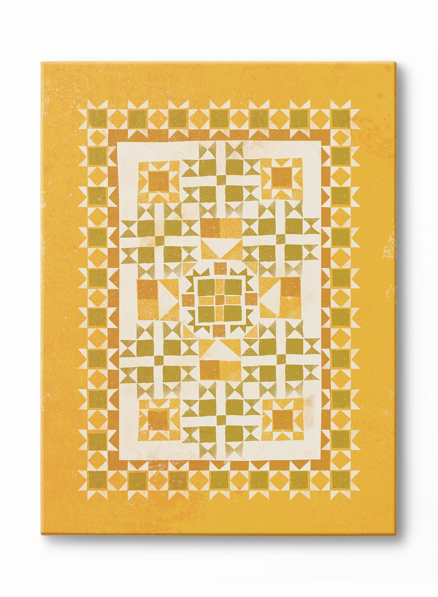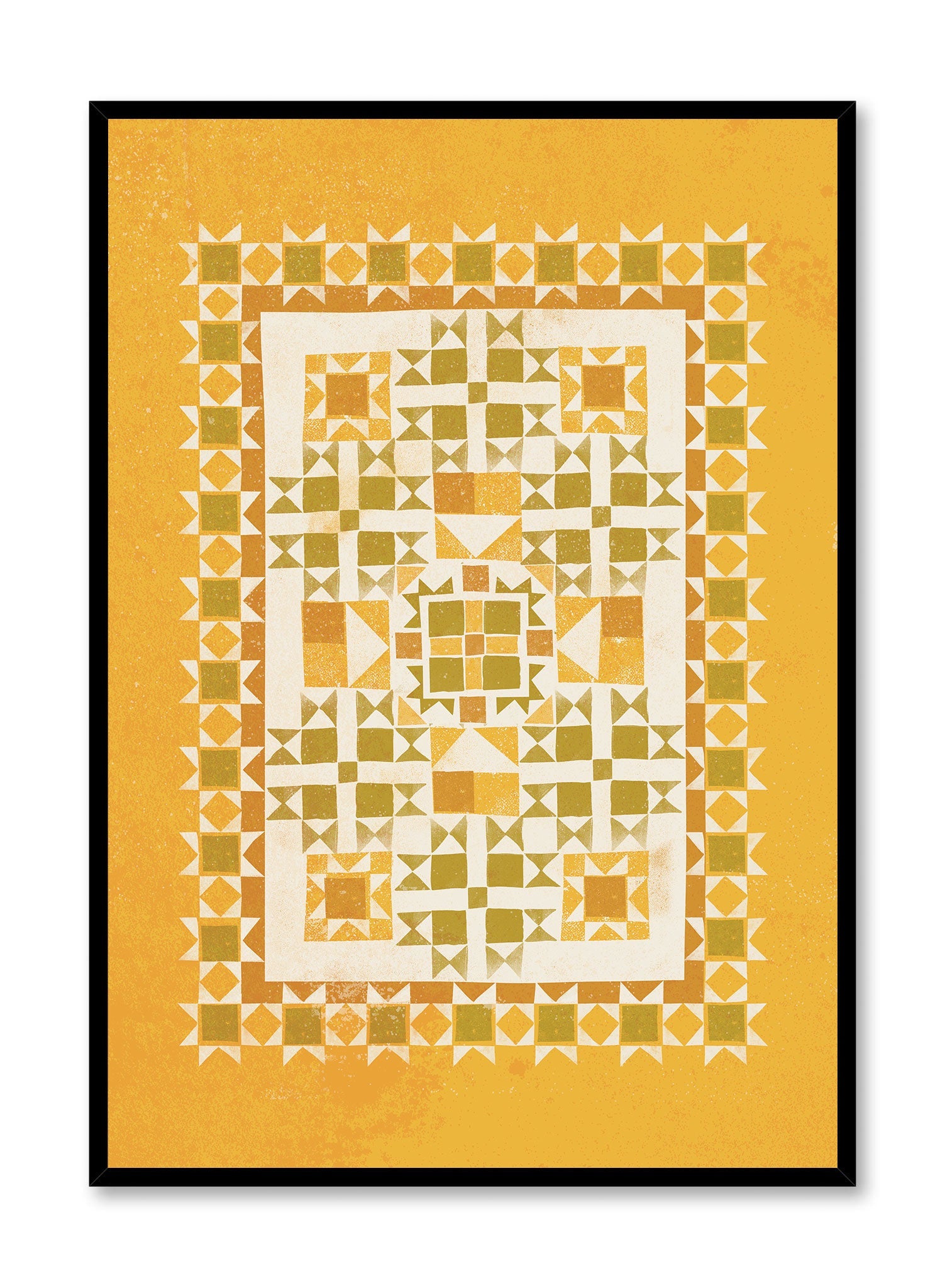 This print features a geometric pattern reminiscent of traditional quilt designs, set against a warm mustard background. The intricate arrangement of triangles and squares forms a symmetrical motif, creating a sense of balance and harmony. The use of olive green and cream adds depth and contrast, drawing the eye to the center of the composition.